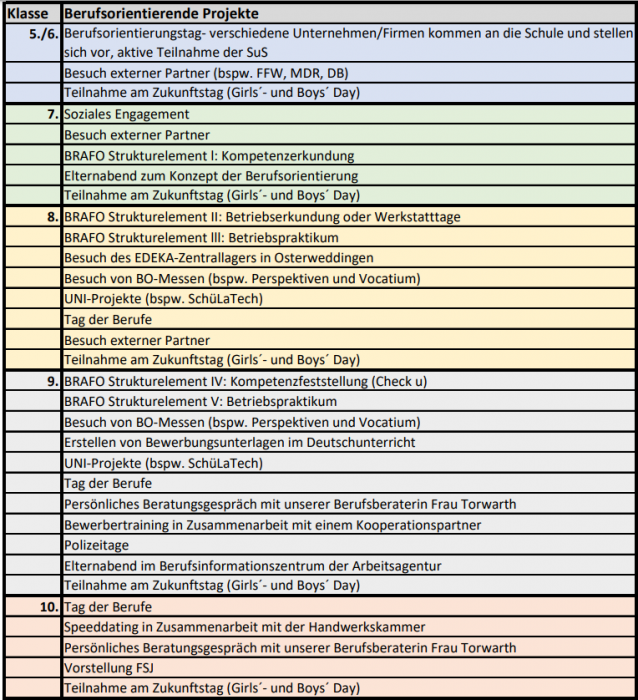 Als Schule mit besonderer Berufsvorbereitung und Studienorientierung ist es unsere Aufgabe, unsere SchülerInnen in jeder Klassenstufe altersgerecht mit berufswahlbezogenen Inhalten, sowohl im normalen Fachunterricht, als auch in Projekten auf das Leben nach der allgemeinbildenden Schule vorzubereiten. Dafür nutzen wir zahlreiche Kontakte zu außerschulischen Kooperationspartnern und Unternehmen in Magdeburg.